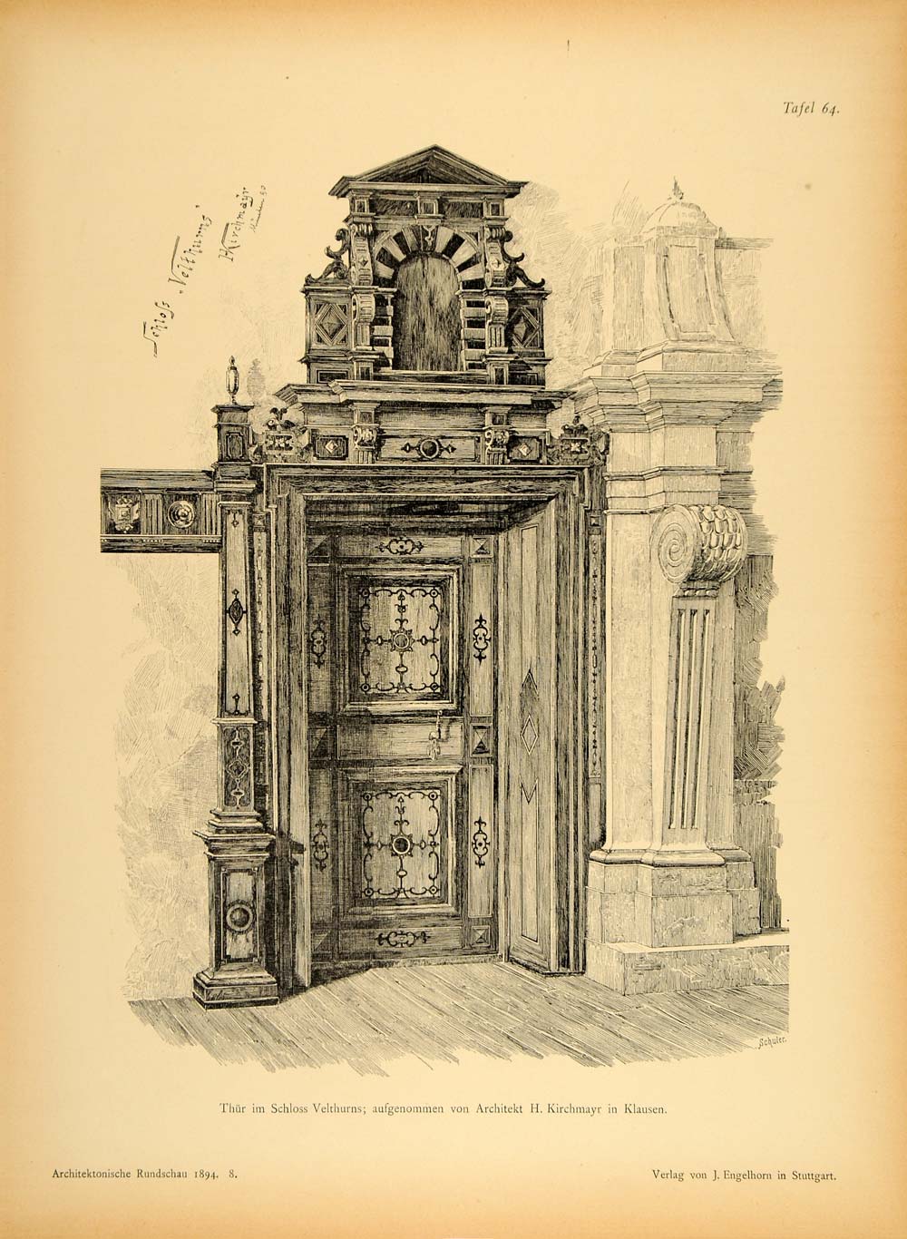 This is an original 1894 halftone print of an architectural sketch of a wooden carved door of Schloss Velthurns by H. Kirchmayr (signature in print, top left corner).