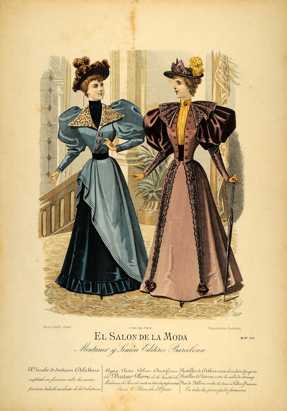 This is an original 1894 hand-colored lithograph of two of the latest Paris fashions in overcoats for women from the rare and highly collectible Spanish fashion journal