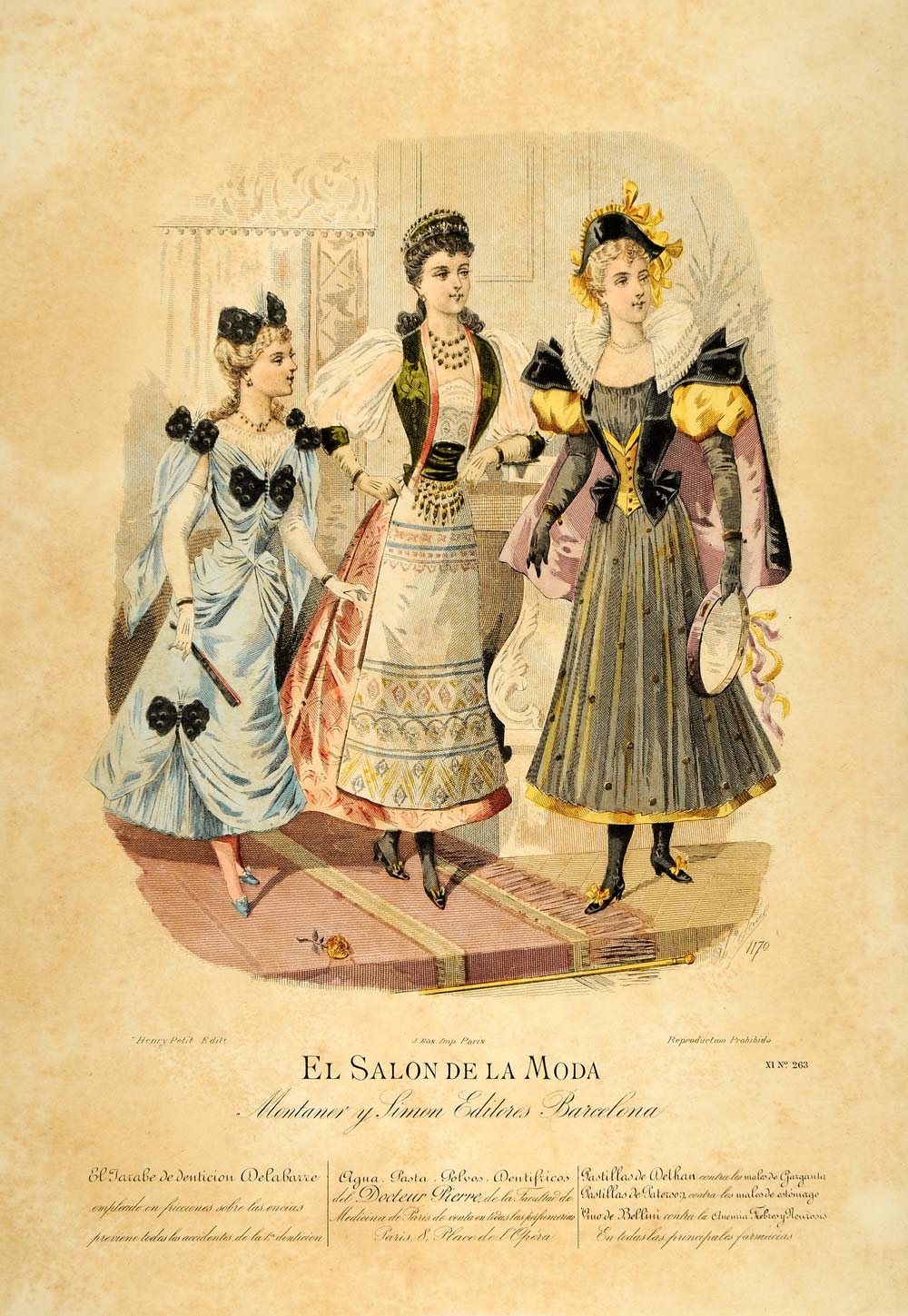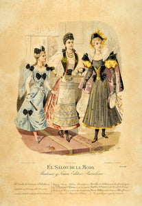 This is an original 1894 hand-colored lithograph of three of the latest Paris fashions for women from the rare and highly collectible Spanish fashion journal