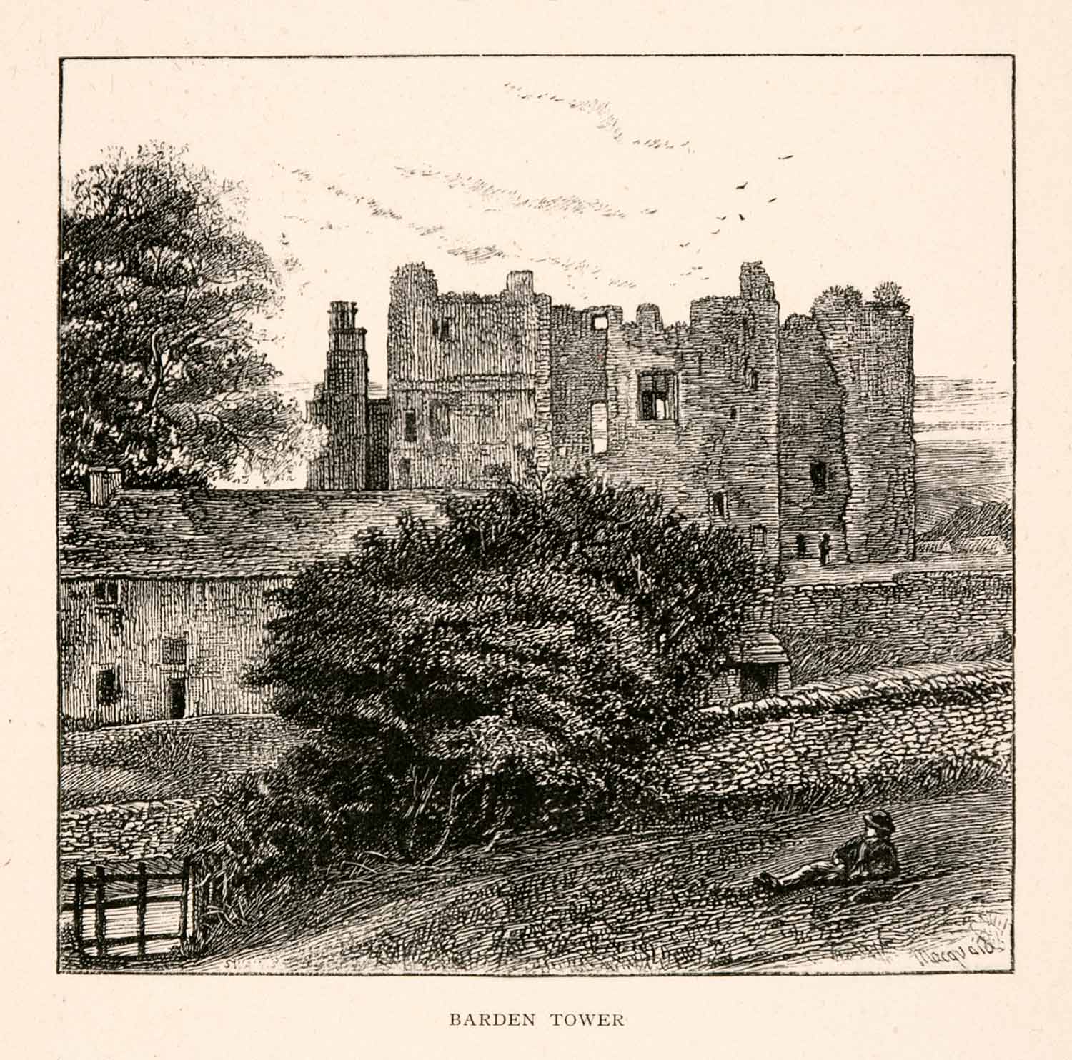 This is an original 1894 black and white in-text wood engraving of "Barden Tower" in Yorkshire, England.