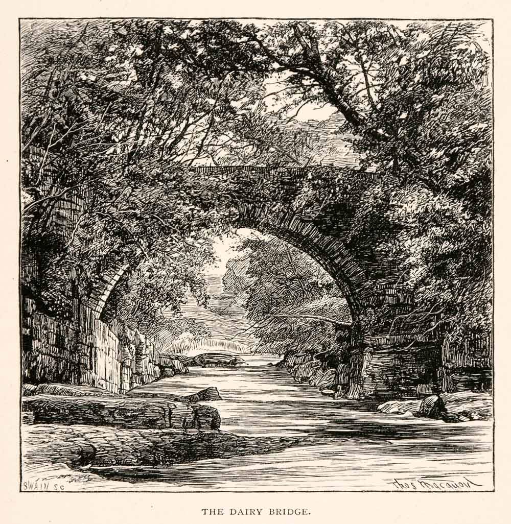 This is an original 1894 black and white in-text wood engraving of "The Dairy Bridge" in Yorkshire, England.