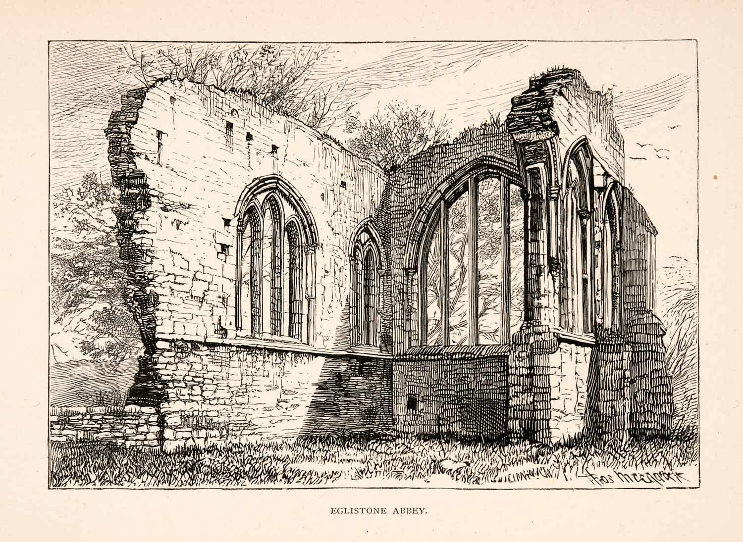 This is an original 1894 black and white wood engraving of "Englistone Abbey" in Yorkshire, England.