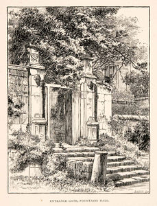This is an original 1894 black and white in-text wood engraving of "Entrance Gate, Fountains Hall" in Yorkshire, England.