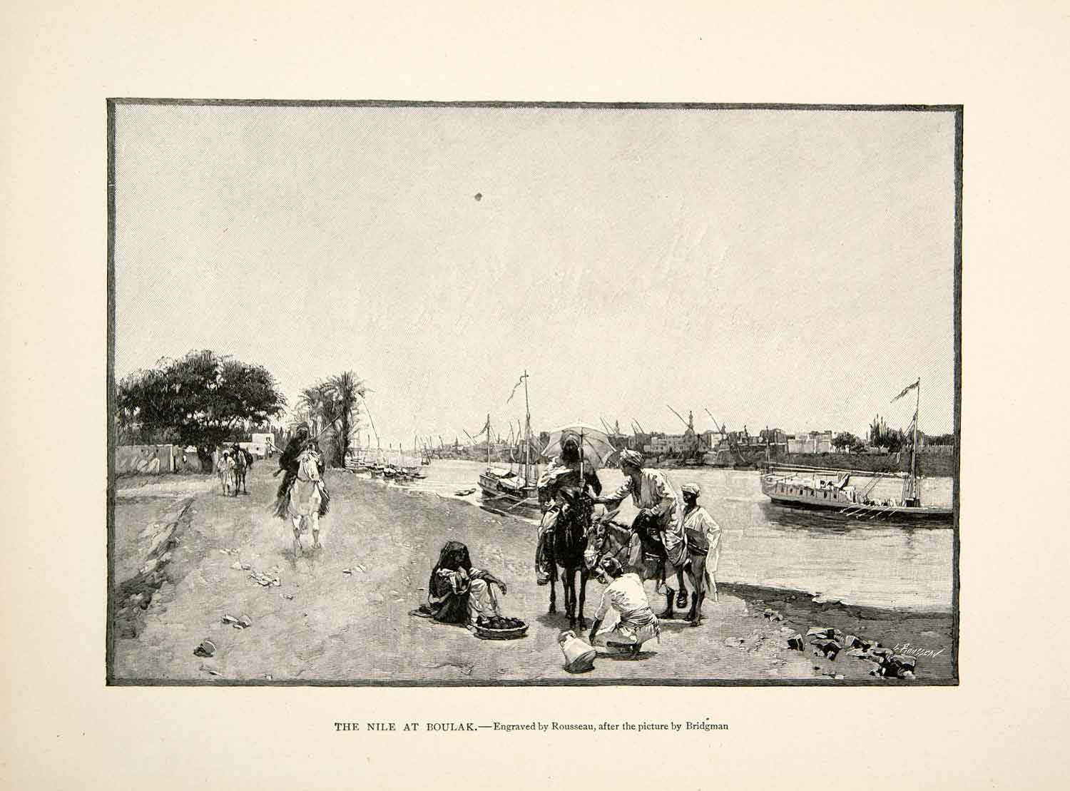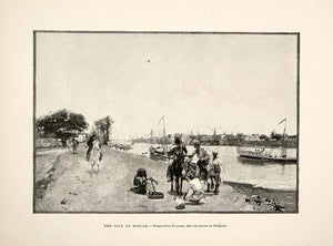 This is an original 1894 black and white wood engraving of the Nile River as seen from the banks of Boulaq, a district of the capital, Cairo, Egypt.
