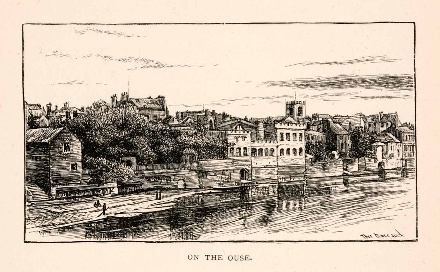 This is an original 1894 black and white in-text wood engraving of "On The Ouse" in Yorkshire England.