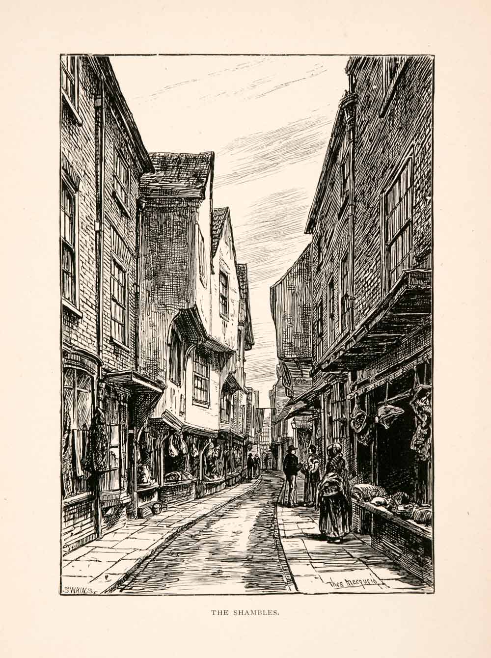 This is an original 1894 black and white wood engraving of "The Shambles" in Yorkshire, England.