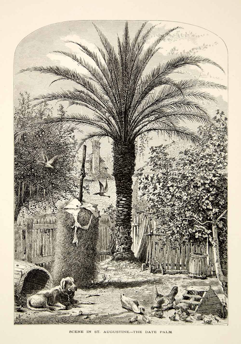1894 Wood Engraving St. Augustine Florida Date Palm Tree Dog Harry Fenn Art YPA4