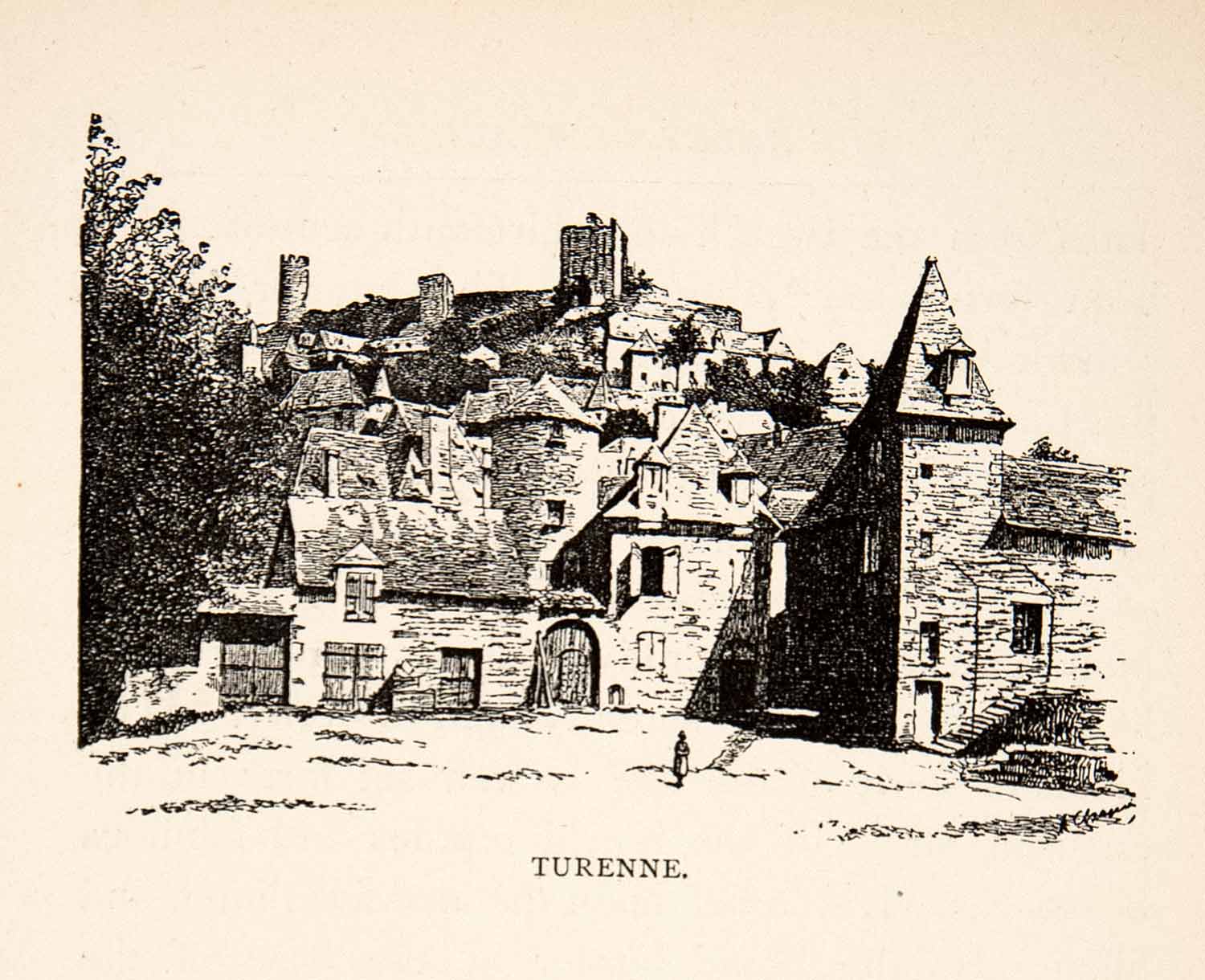 This is an original 1894 black and white in-text wood engraving of the town of Turenne in the Limousin region of France. The town is of of the most beautiful in all of France due to its location atop the limestone cliffs of Martel Causse. It comes as no surprise that the cities number one industry is tourism.