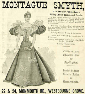 This is an original 1895 black and white print ad for Montague Smyth, Ladies Tailor, Riding Habit Maker, and Furrier, 22 & 24 Monmouth Rd., Westbourne Grove, London. The ad includes an illustration of a lovely Victorian evening gown.