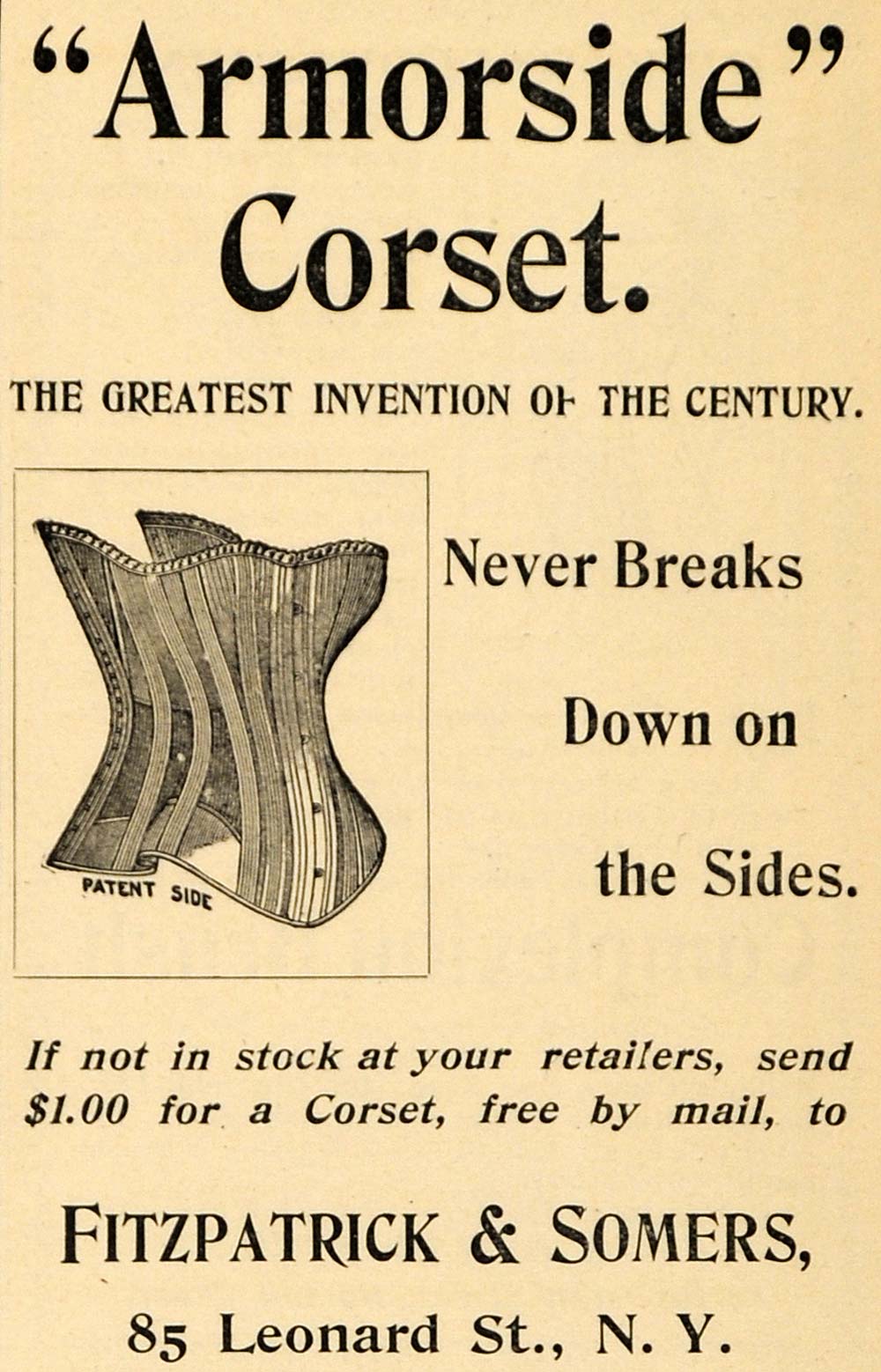 This is an original 1895 black and white print ad for the "Armorside" Corset by Fitzpatrick & Somers located at 85 Leonard Street, New York.