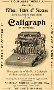 This is an original 1895 black and white print ad for the Caligraph Typewriter by the American Writing Machine Company located at 237 Broadway, New York City.