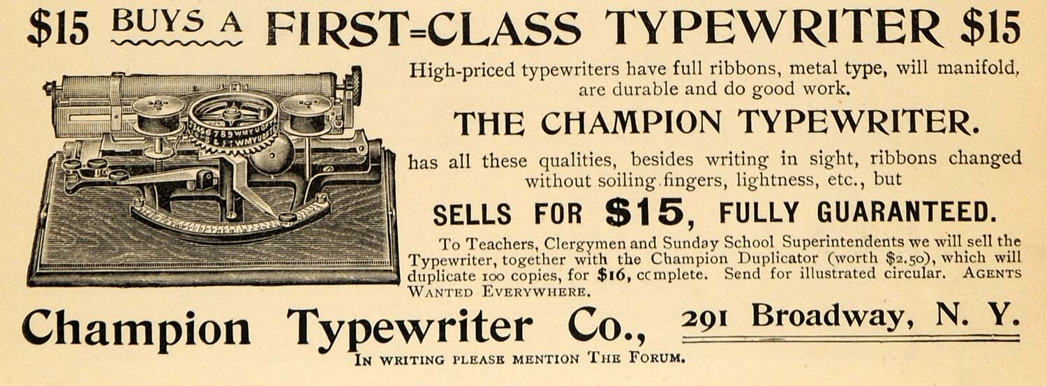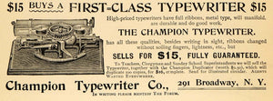 This is an original 1895 black and white print ad for the Champion Typewriter Company, located at 291 Broadway in New York. This ad features their Champion Typewriters that are fully guaranteed.