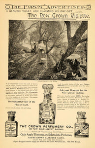 This is an original 1895 black and white print ad for the Crown Perfumery Company, located at 177 New Bond Street in London, England. This ad features their Crown Violette, Crab-Apple Blossoms, and Matsukita Perfumes.