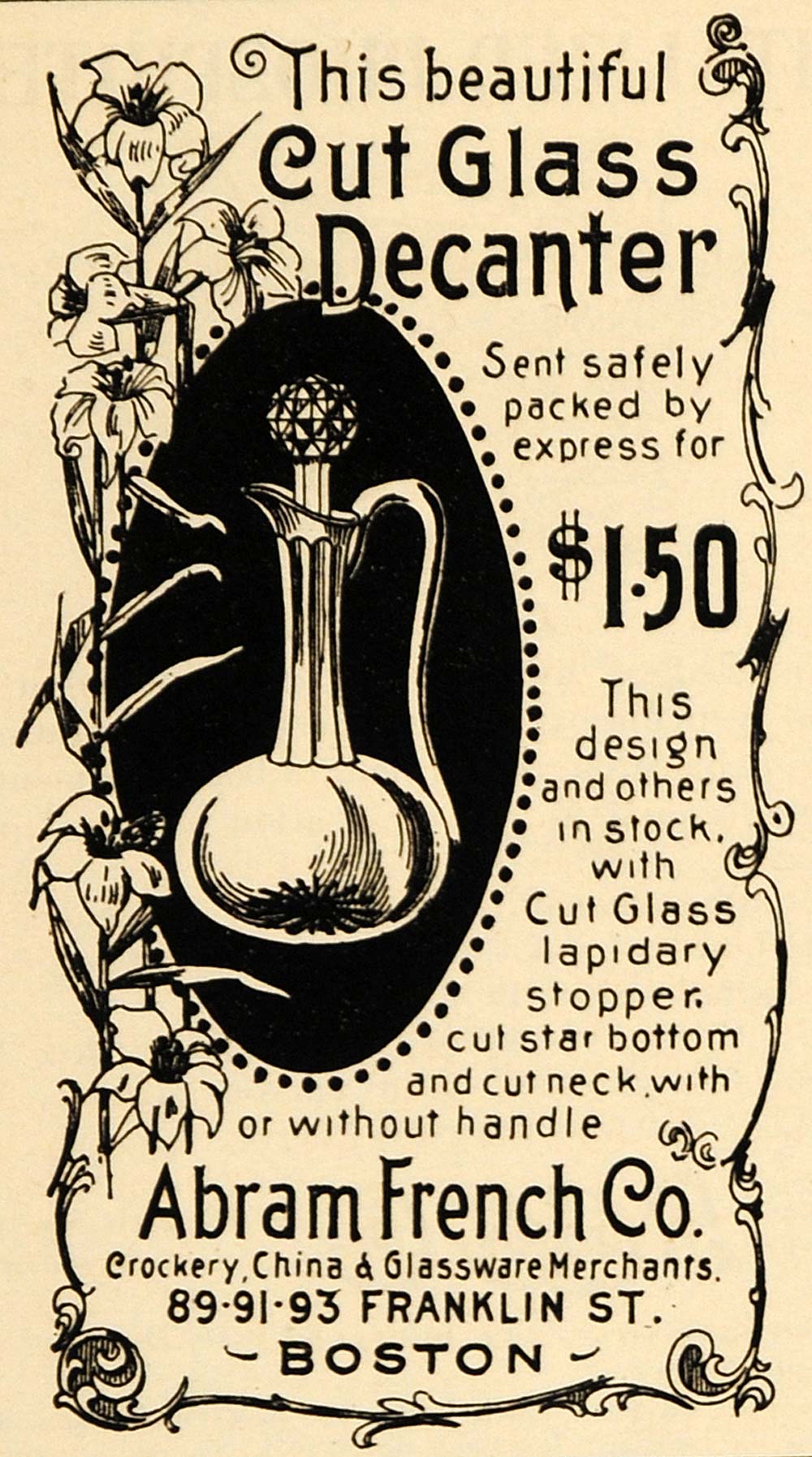 This is an original 1895 black and white print ad for a cut glass decanter by Abram French Company located at 89-91-93 Franklin Street, Boston, Massachusetts.