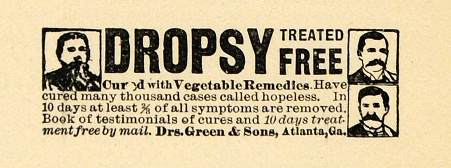 This is a tiny original 1895 black and white print ad for Dropsy Treatment from Drs. Green & Sons located in Atlanta, Georgia.