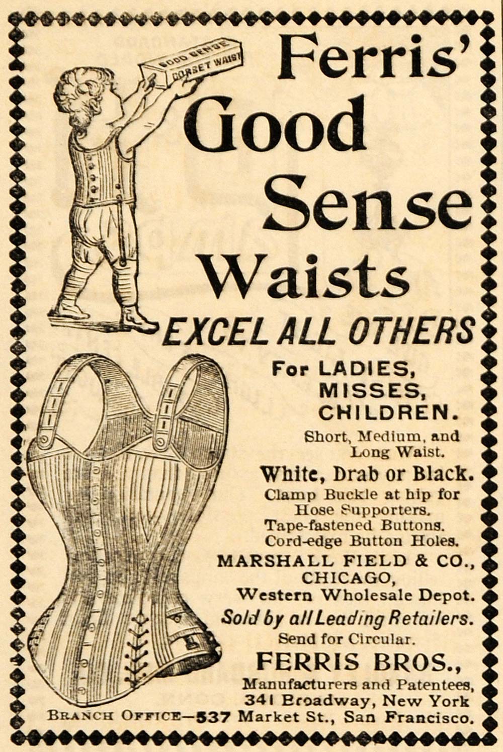 This is an original 1895 black and white print ad for Ferris' Good Sense Waists for ladies, misses and children. Ferrris Brothers manufactures these corsets, they are located at 341 Broadway, New York City. There is a branch located at 537 Market Street, San Francisco.