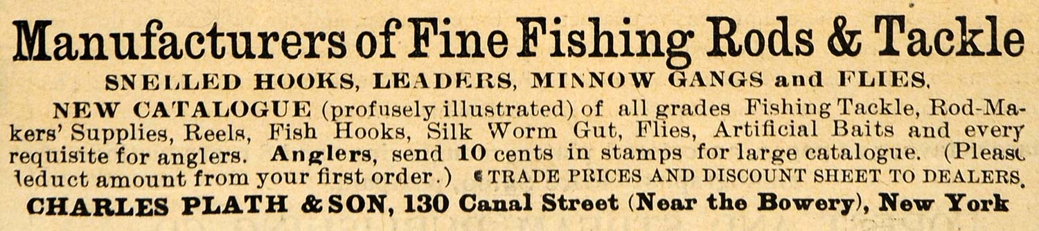 This is a tiny original 1895 black and white print ad for fishing rods, tackle, snelled hooks, leaders, minnow gangs and flies by Charles Plath & Son located at 130 Canal Street (near the Bowery), New York City.