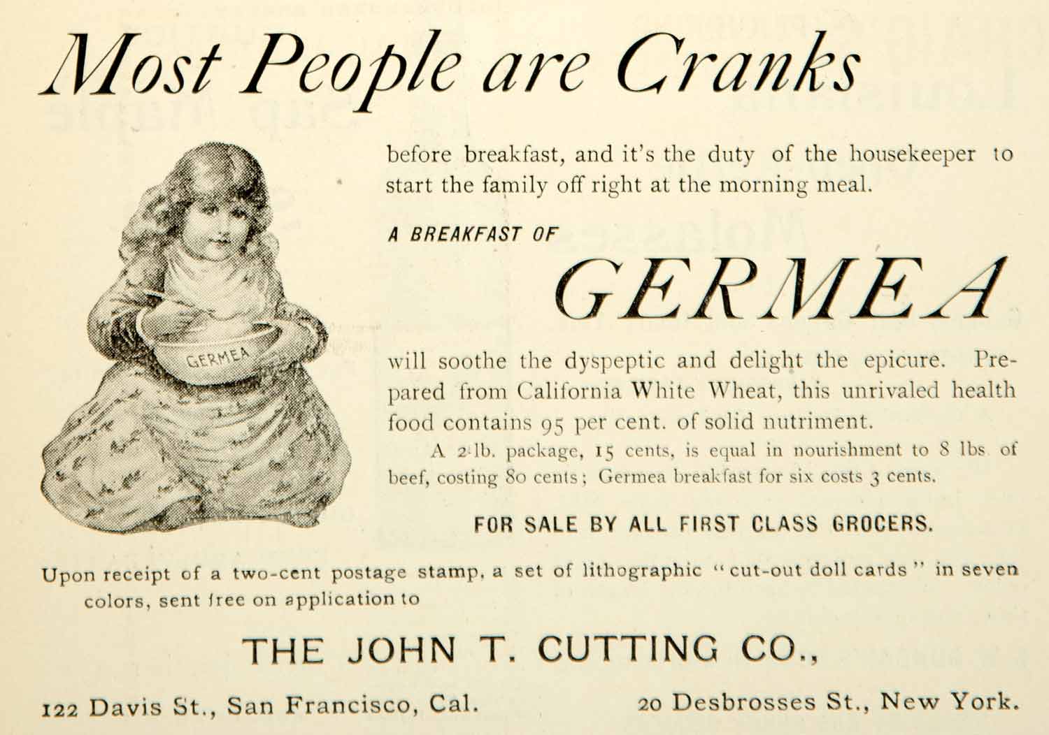 This is an original 1895 black and white print ad for Germea breakfast cereal that was sold by the John T. Cutting Company of 122 Davis Street, San Francisco, CA and 20 Desbrosses St, NYC.