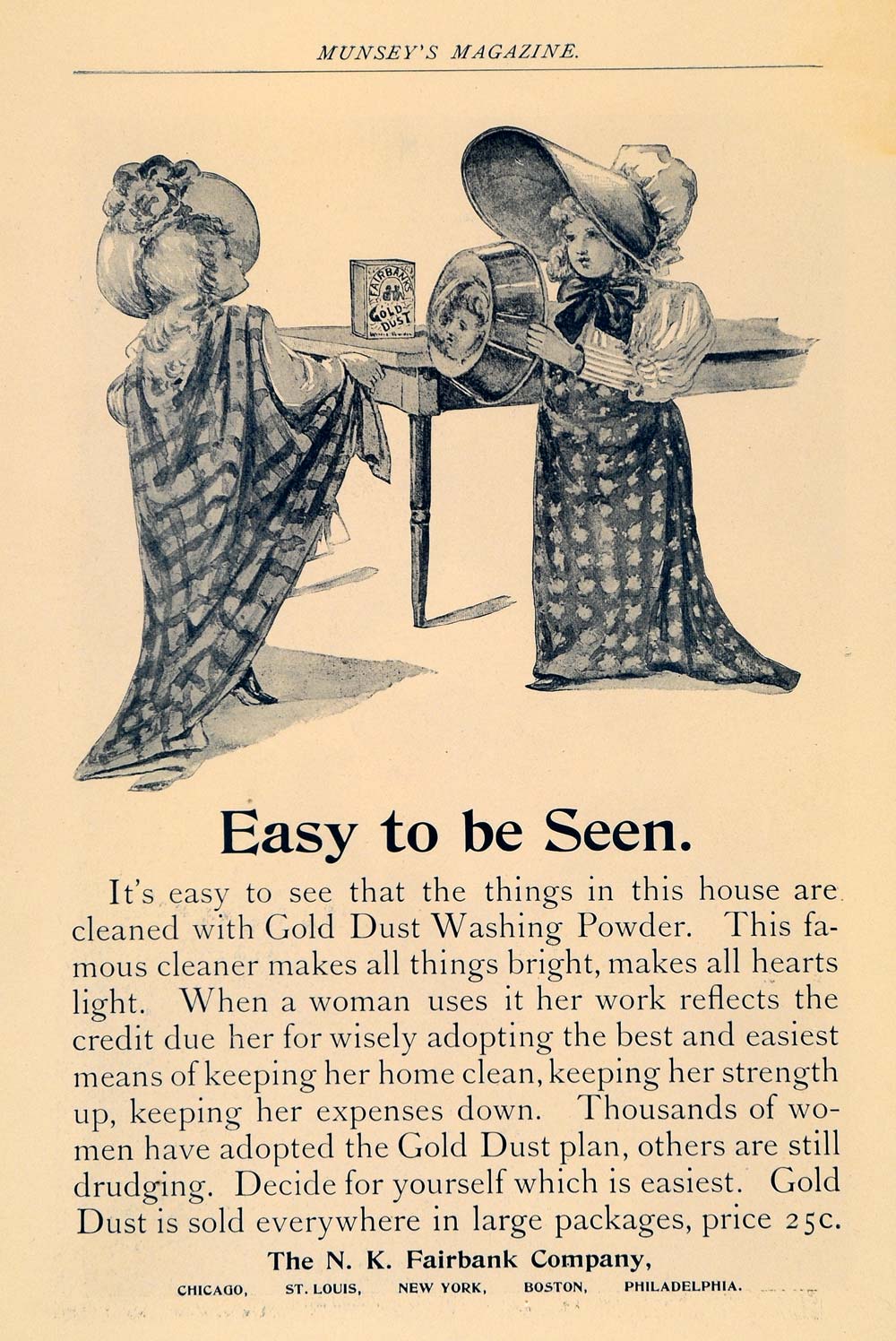 Gold Dust Washing Powder and Gold Dust Scouring Soap were two of the Fairbank CompanyÕs best-known products. The spike in popular demand due to low price initially sparked in the Midwest; however, brand recognition spread, and the Gold Dust brand soon became one of the most mass marketed products in the United States. The Gold Dust brand was a popular household item for the next sixty years until fierce competition, such as Proctor & Gamble became a nearly undefeatable opponent in the market.