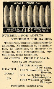 This is an original 1895 black and white print ad for the Health Food Company, located at 61 Fifth Avenue in New York, 199 Tremont Street in Boston, 632 Arch Street in Philadelphia, and 1601 Wabash Avenue in Chicago. This ad features the company's gluten suppositories and constipation pill cures.