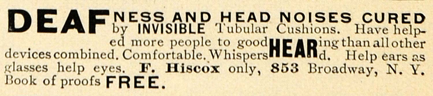 This is a tiny original 1895 black and white print ad for curing deafness and head noises with the Invisible Tubular Cushions by F. Hiscox located at 853 Broadway, New York City.