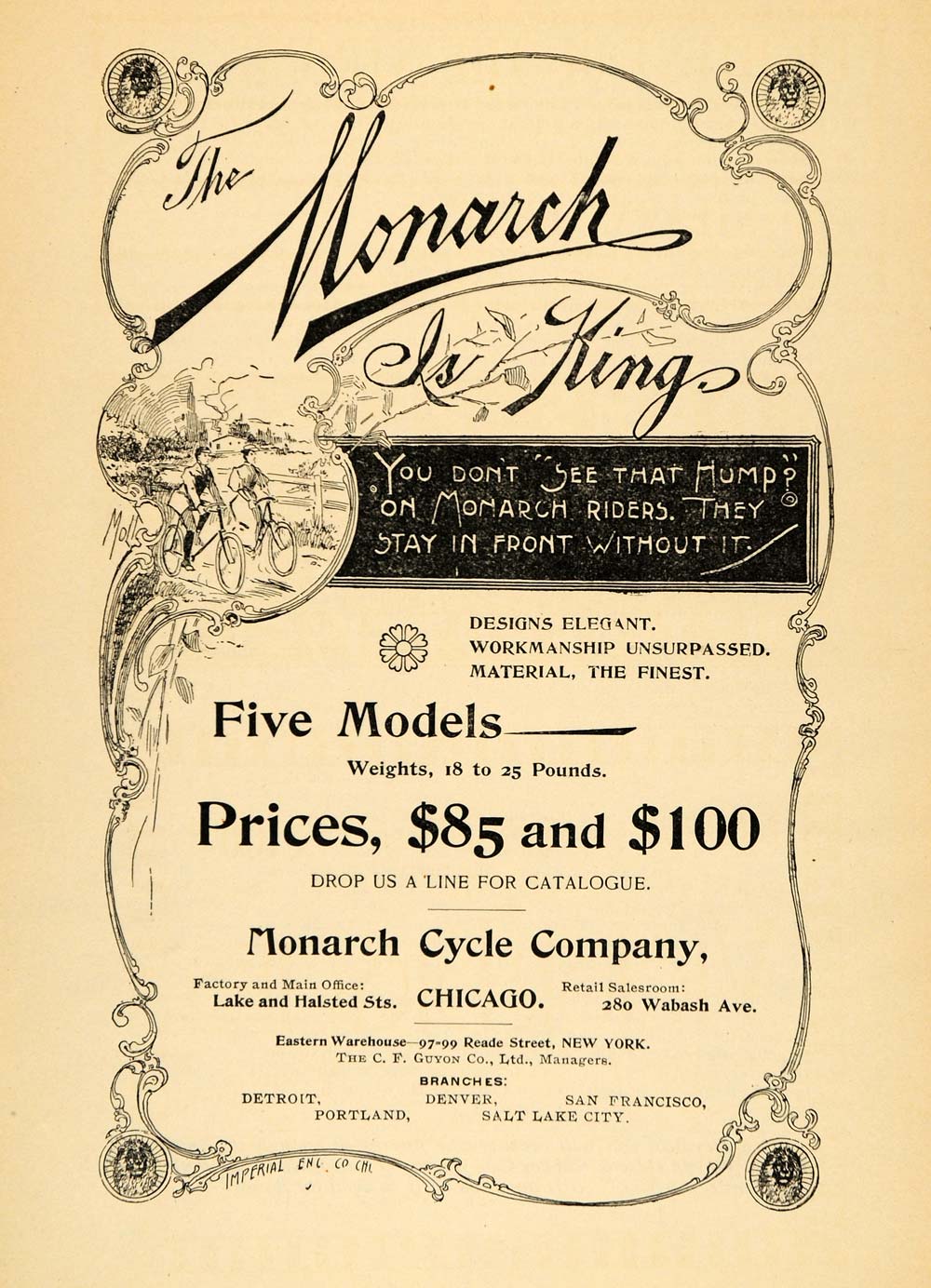 This is an original 1895 black and white print ad for Monarch bicycles by the Monarch Cycle Company. Locations: Lake and Halsted Streets, Chicago; 280 Wabash Avenue, Chicago; 97-99 Reade Street, New York City (The C. F. Guyon Company, Ltd.).