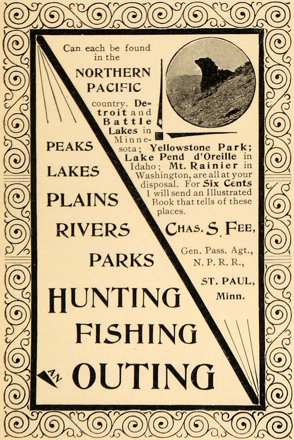 This is an original 1895 black and white print ad for the Northern Pacific Railroad, offering trips to Battle Lakes, Yellowstone Park, Lake Pend d'Oreille, and Mount Rainier. Chas. S. Fee is their General Passenger Agent of St. Paul Minnesota.