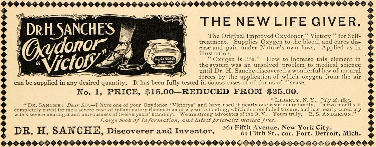 This is an original 1895 black and white print ad for Oxydonor Victory from Dr. H. Sanche located in Detroit, Michigan.