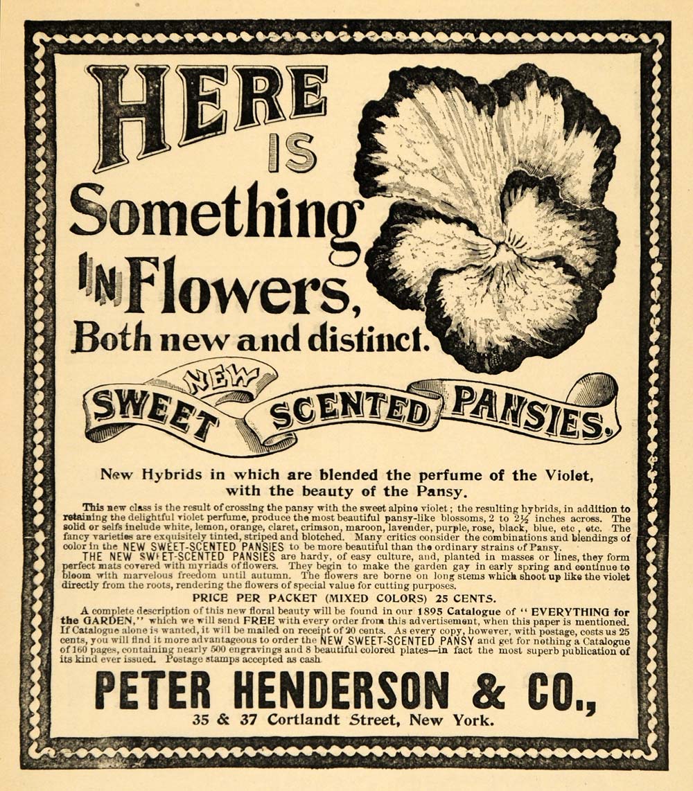 This is an original 1895 black and white print ad for new sweet scented pansies by Peter Henderson & Company located at 35 & 37 Cortlandt Street, New York City.