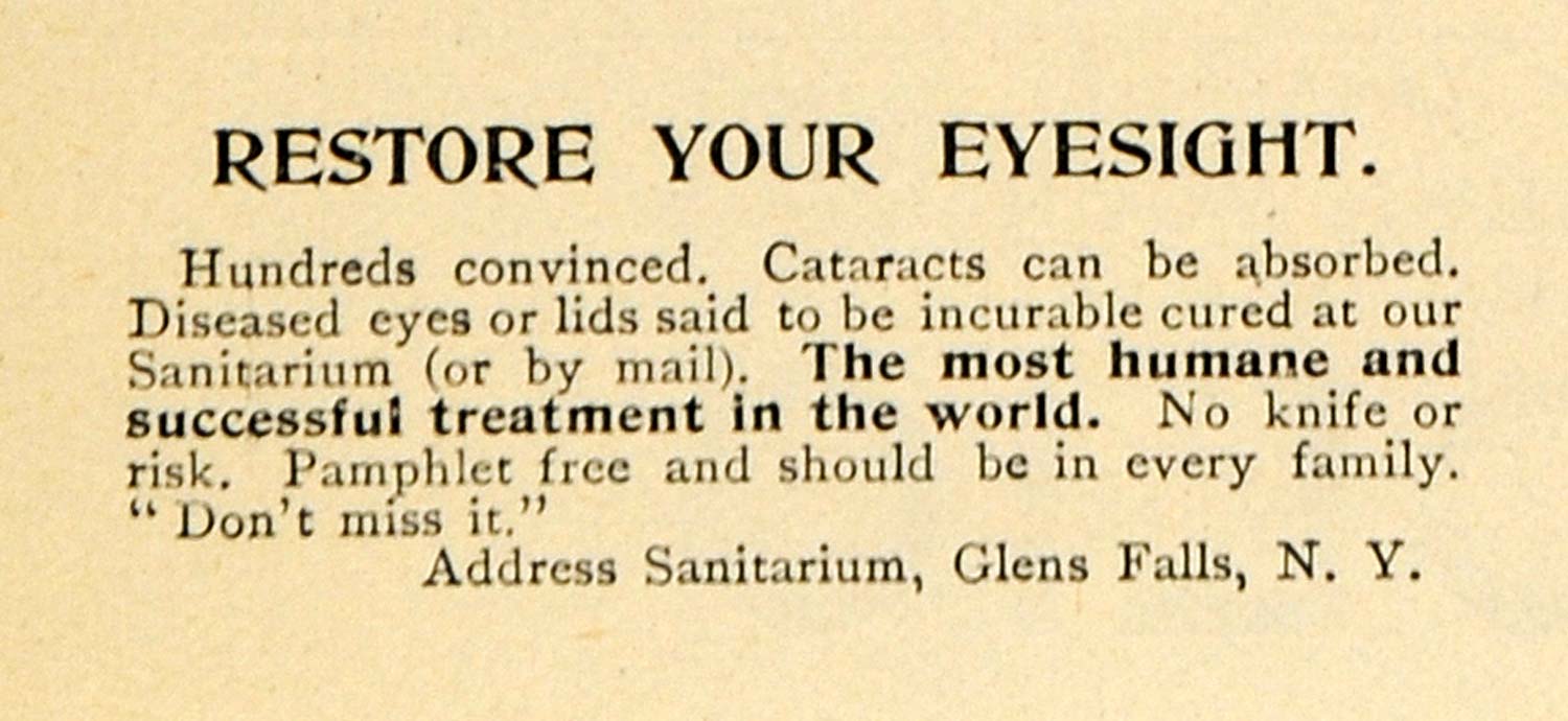 This is a tiny original 1895 black and white print ad for Restored Eyesight from the Sanitarium located in Glens Dalls, New York.