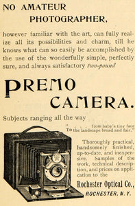 This is an original 1895 black and white print ad for the Rochester Optical Company of Rochester, New York. This ad features their Premo Cameras, which can photograph everything from "baby's tiny face to the landscape broad and fair."