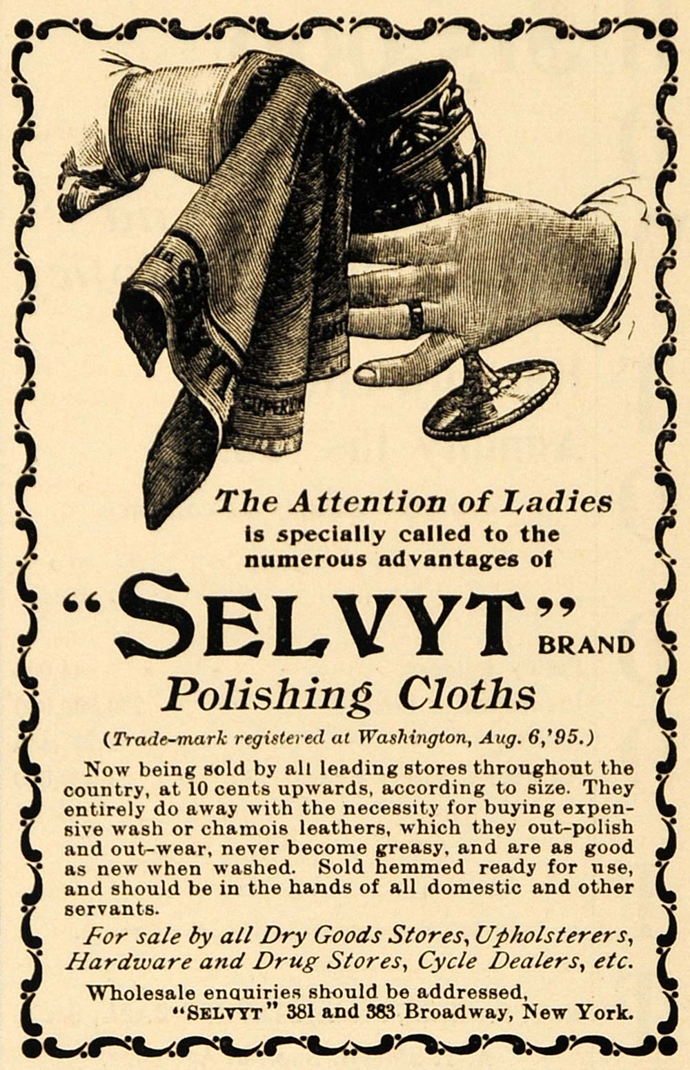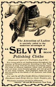 This is an original 1895 black and white print ad for "Selvyt" Brand Polishing Cloths. Selvyt is located at 381 and 383 Broadway, New York City.