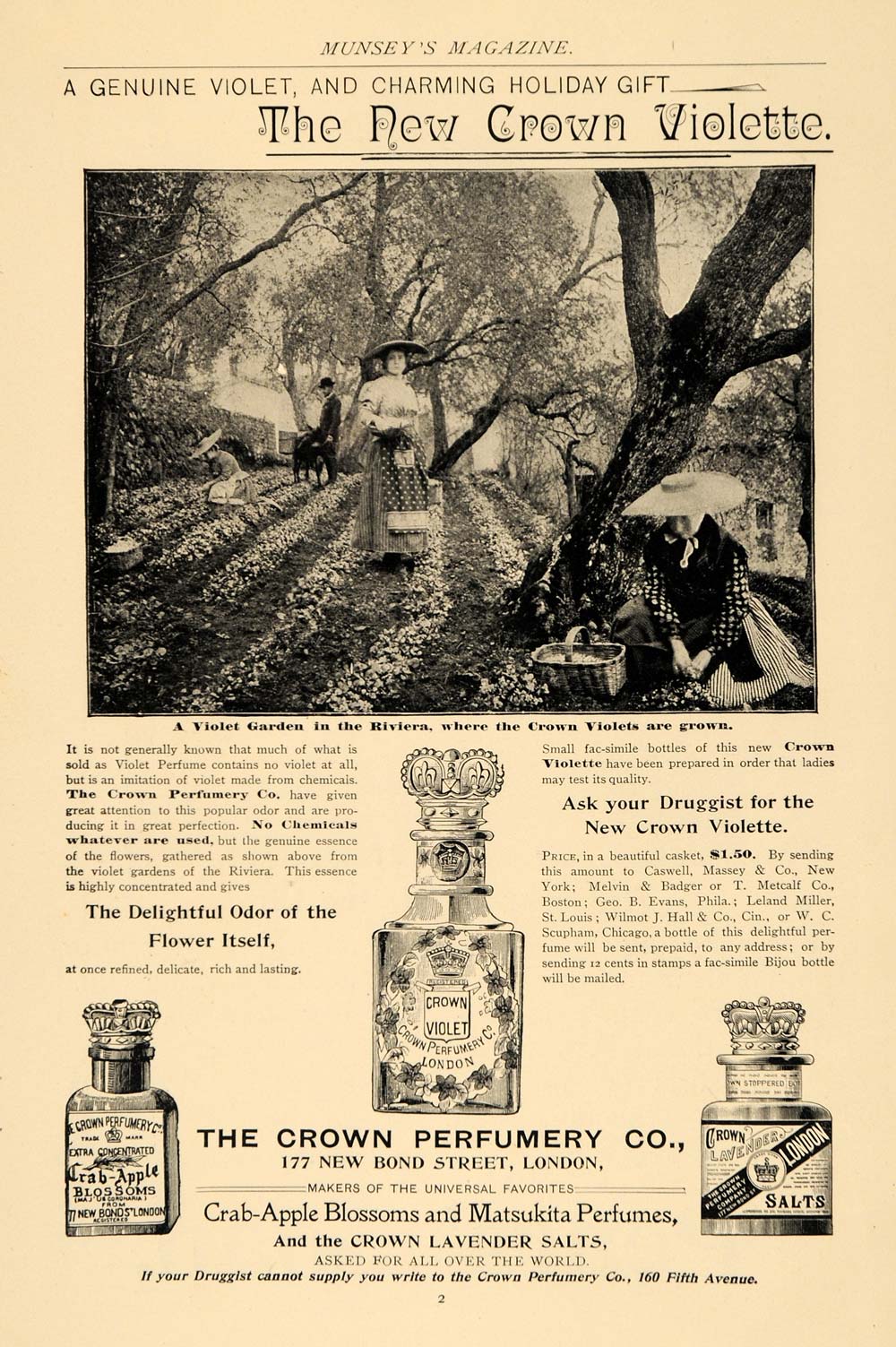 This is an original 1895 black and white print ad for the New Crown Violette by The Crown Perfumery Company located at 177 New Bond Street, London. This ad has a picture of a violet garden in the Riviera where the Crown Violets are grown.