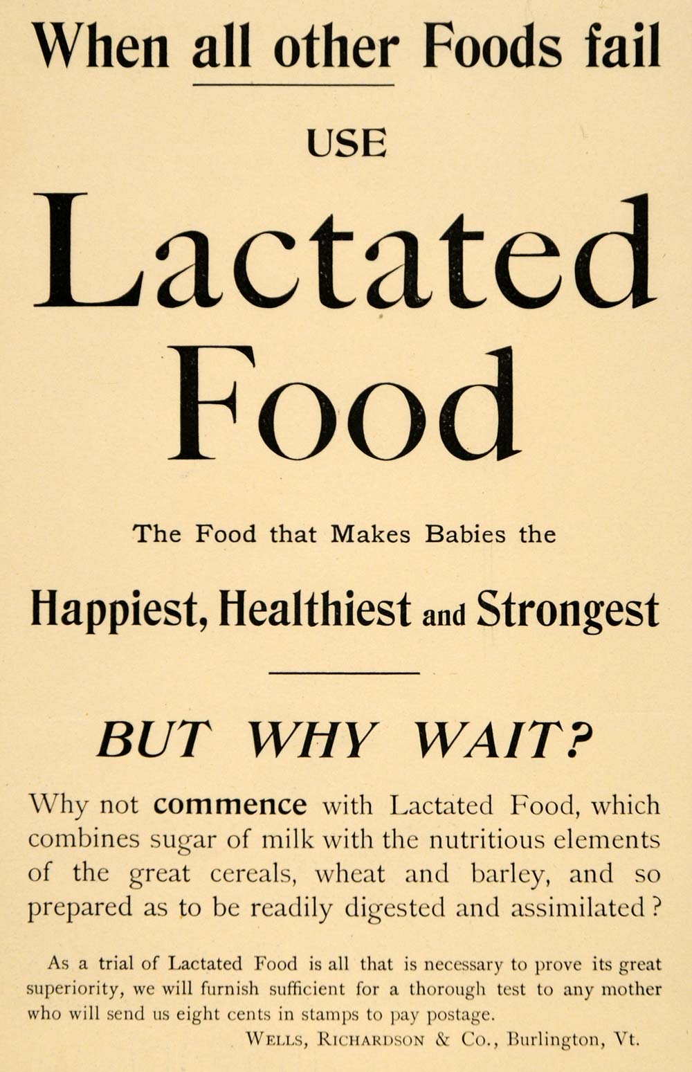 This is an original 1895 black and white print ad for Lactated Food, a product by Wells, Richardson & Company in Burlington, Vermont.
