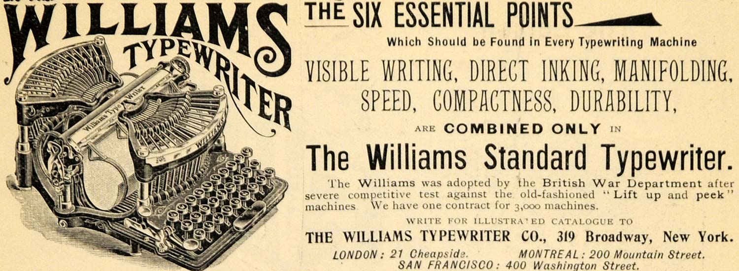 This is an original 1895 black and white print ad for the Williams Typewriter Company of 319 Broadway in New York (as well as 21 Cheapside in London, 200 Mountain Street in Montreal, and 400 Washington Street in San Francisco). This ad features their Williams Standard Typewriter which was adopted by the British War Department.