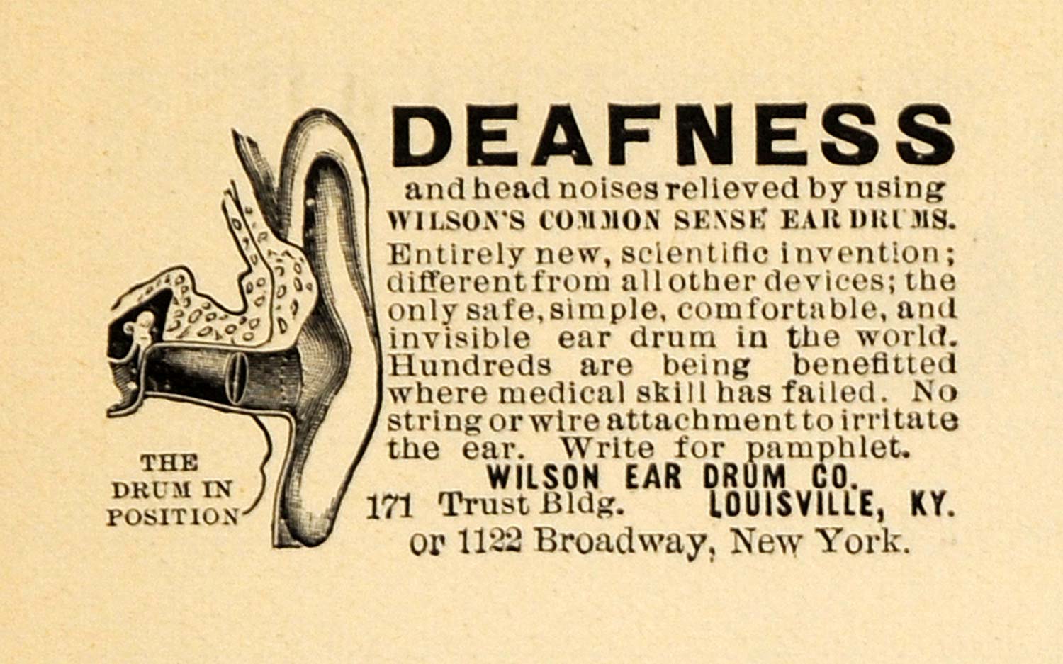 Keywords specific to this image: deafness, deaf, ear canal, scientific invention Antique Advertising