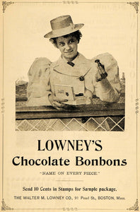 This is an original 1895 black and white print ad for Lowney's Chocolate Bonbons by The Walter M. Lowney Company located at 91 Pearl Street, Boston, Massachusetts.