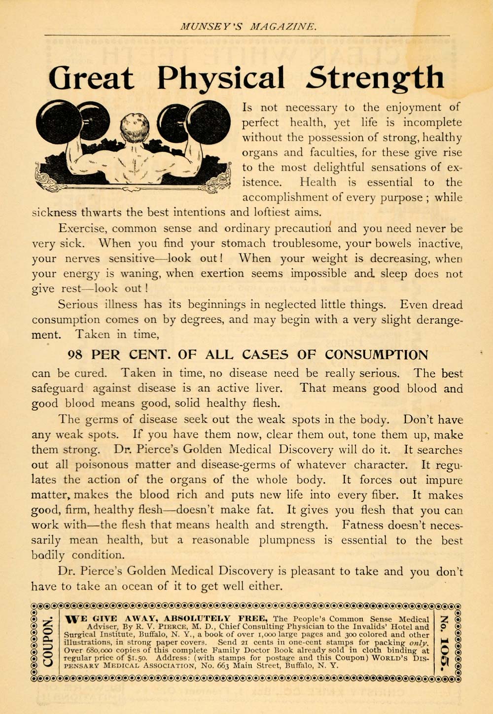 Keywords specific to this image: fitness, The People's Common Sense Medical Adviser, R. V. Pierce M. D., Invalid's Hotel and Surgical Institute, health, quackery Antique Advertising