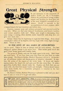 This is an original 1895 black and white print ad for Dr. Pierce's Golden Medical Discovery, it gives you flesh for physical strength, by the World's Dispensary Medical Association located at No. 663 Main Street, Buffalo, New York.