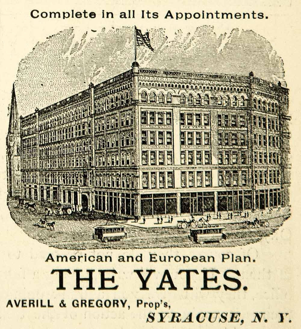 This is an original 1895 black and white print ad for the historic Yates Hotel that was located on the corner of Washington and Montgomery Streets in the city of Syracuse, New York.