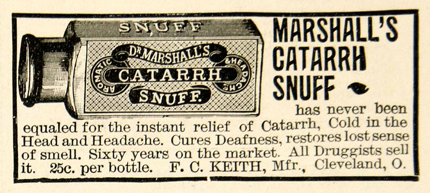 This is an original 1895 black and white print ad for Dr. Marshall's Catarrh Snuff, manufactured by F. C. Keith in Cleveland, Ohio.