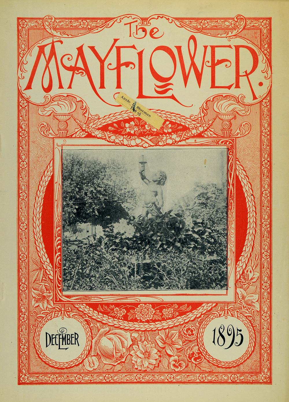 This is an original 1895 color cover the December 1895 issue of The Mayflower, featuring an image of a garden sculpture. Please note there is a yellow sticker on the cover with the name "Annie L Sherman" on it.CONDITION