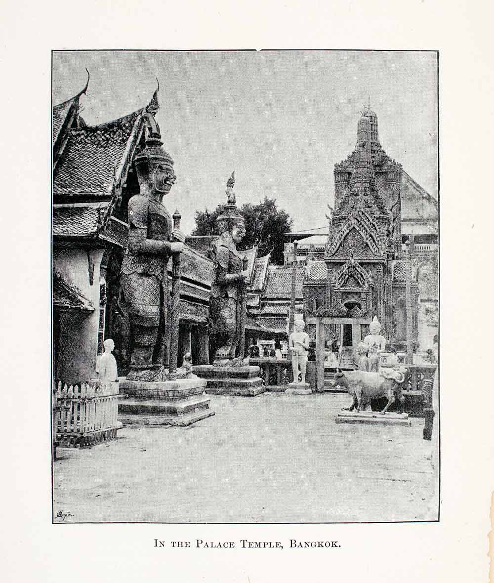 This is an original 1895 black and white halftone print of the temple within the walls of the Phra Borom Maha Ratcha Wang (Grand Royal Palace) of Bangkok, Vietnam. Visible here are statues of Vedic (Hindu) deities and guardians including the Nandi (bull) of legend.