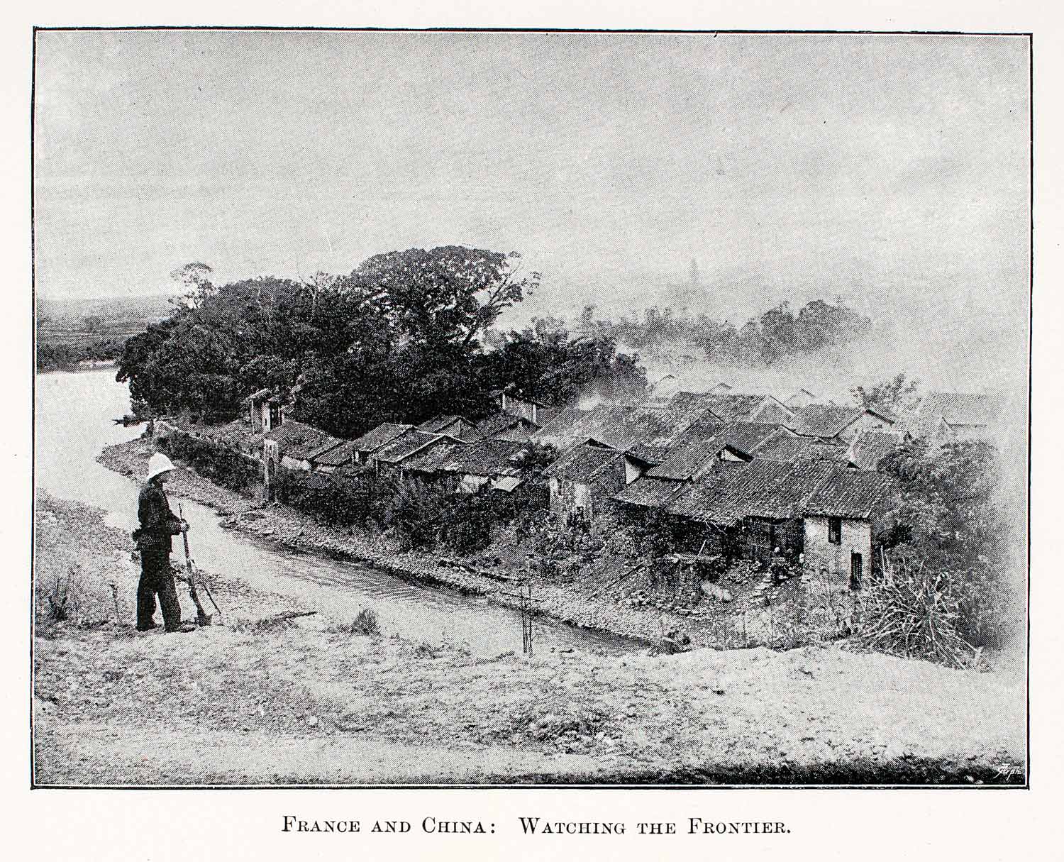 This is an original 1895 black and white halftone print of a French soldier on the banks of the river separating Tongquin, Vietnam, a French Protectorate region, and mainland China. Mist is rising over the small village of Tongquin.