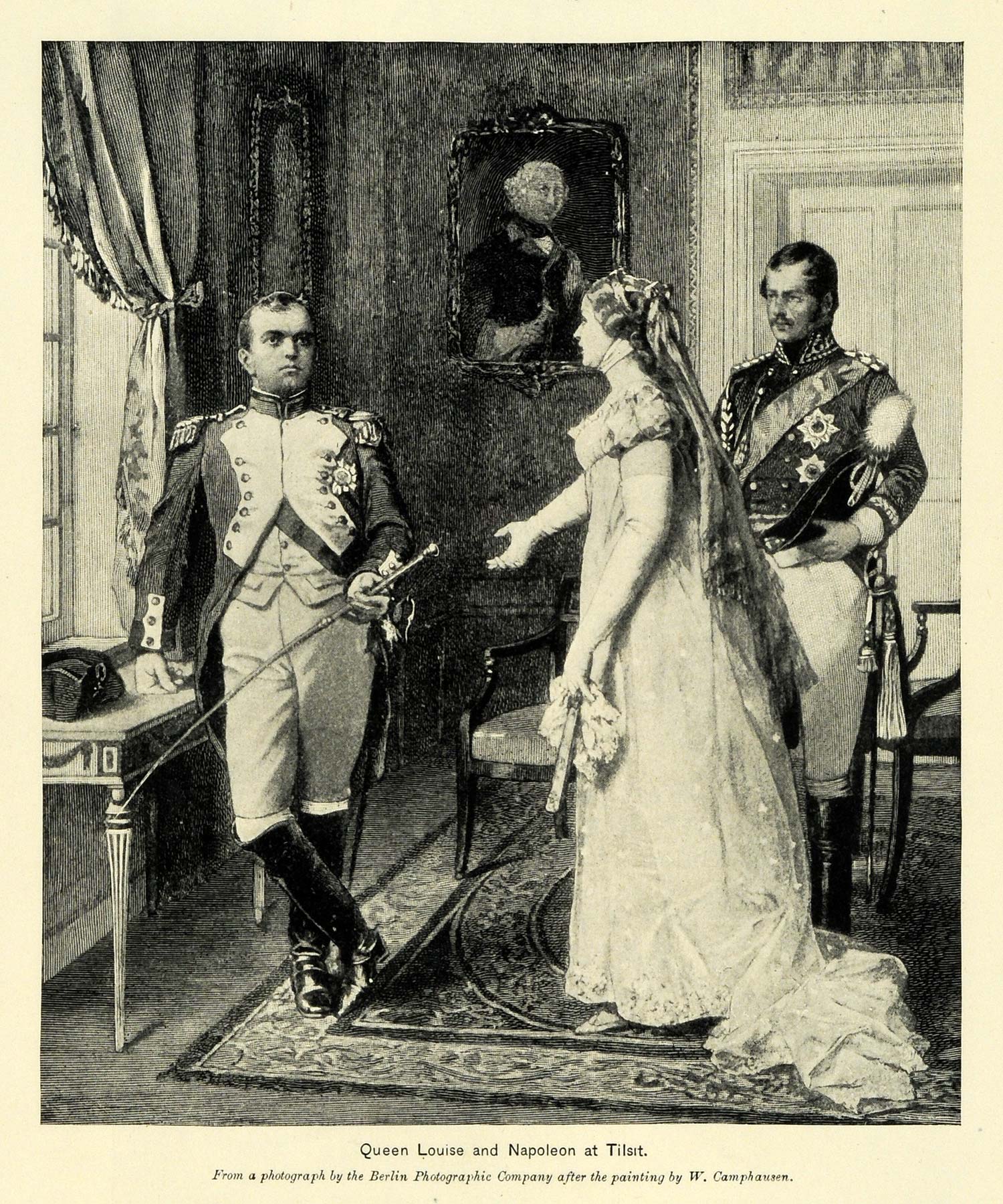 This is an original 1895 halftone print of the unsuccessful meeting between Queen Louise Mecklenburg Strelitz of Prussia and French Emperor Napoleon Bonapart I at Tilsit. Her majesty attempted to plead with Bonapart for favorable terms after Prussia's tremendous losses following the Napoleonic Wars. The Queen died at the tender age of 34. This print features artwork by W. Camphausen.