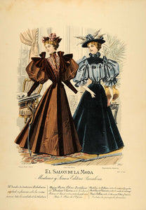 This is an original 1895 hand-colored lithograph of two of the latest Paris fashions for women from the rare and highly collectible Spanish fashion journal