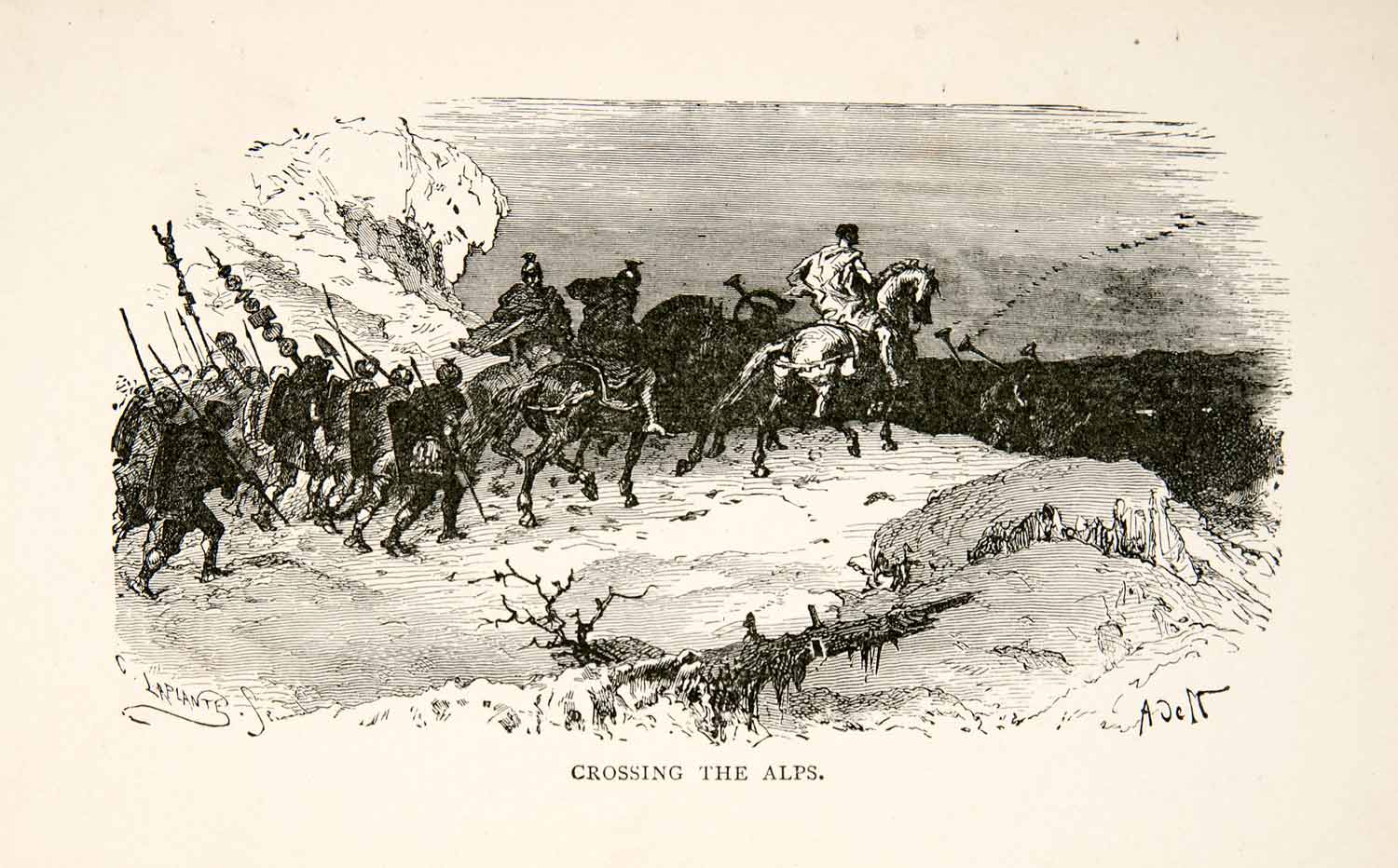 This is an original 1895 black and white wood engraving of Hannibal and his army crossing the Alps around 218 BC.
