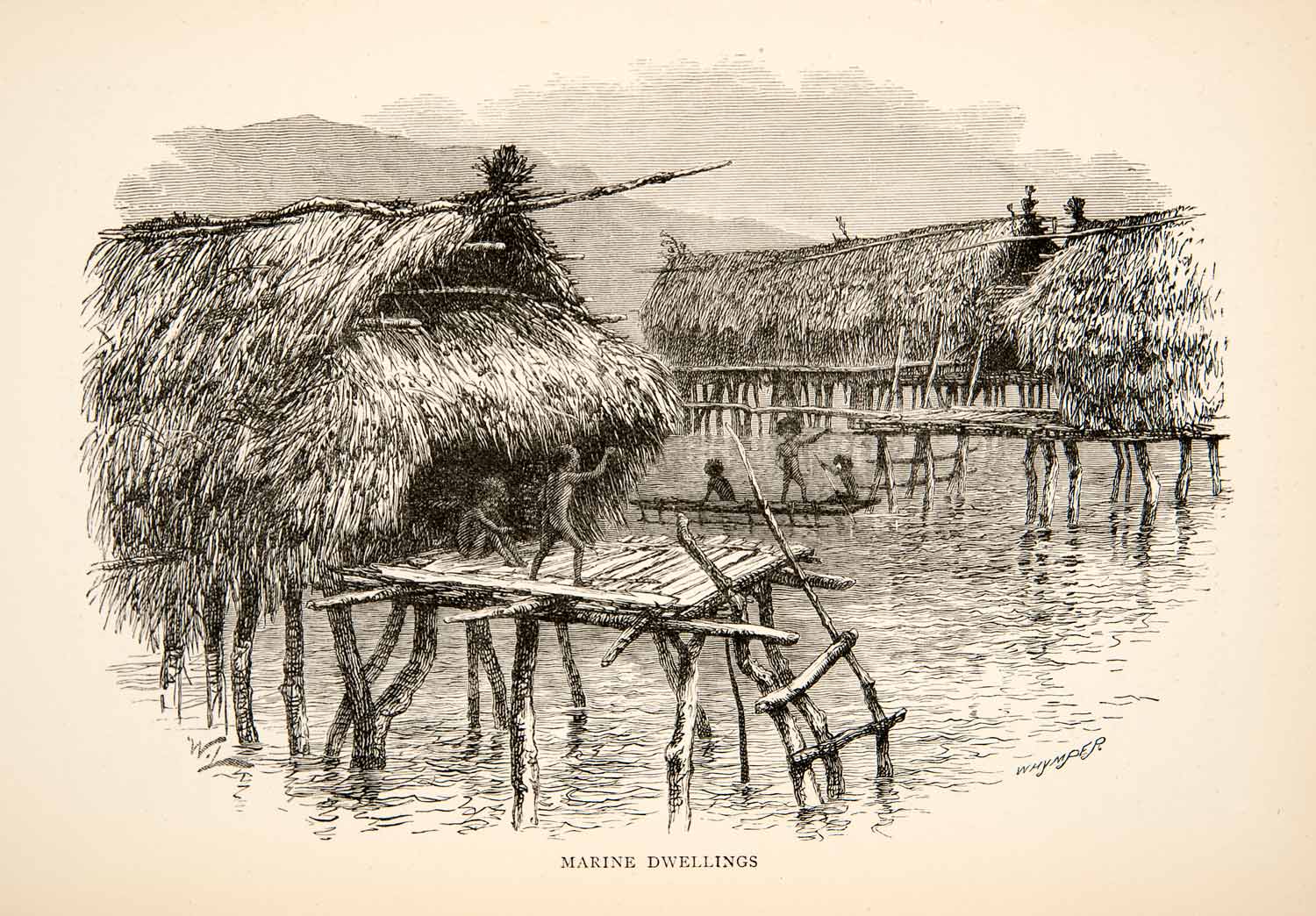 1895 Wood Engraving Marine Dweller House New Guinea Pacific Ocean Edward XGWB1