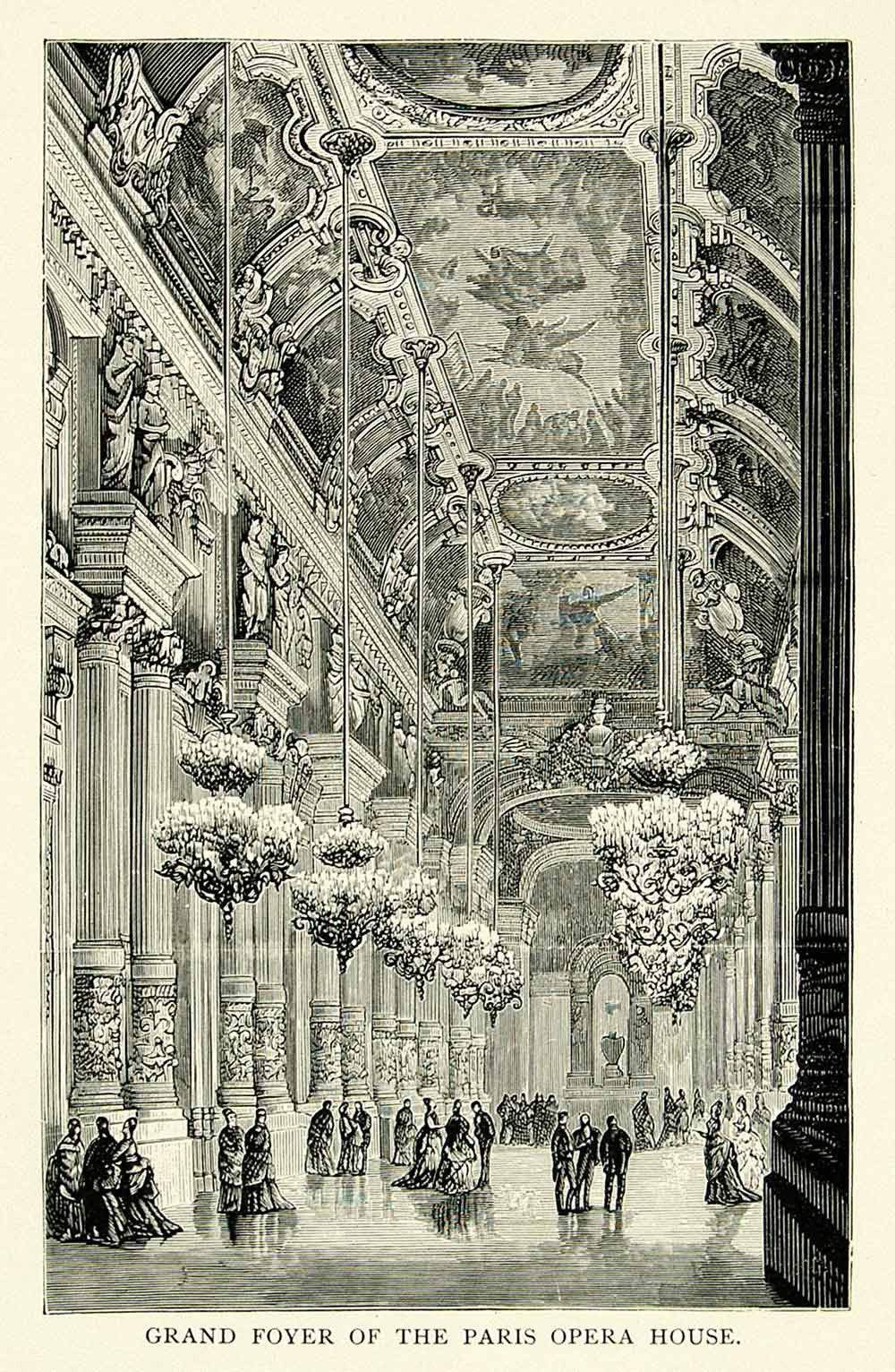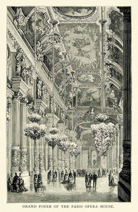 1895 Wood Engraving Palais Garnier Grand Foyer Paris Opera House Architecture