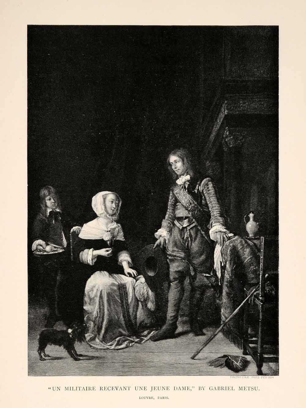 1895 Wood Engraving Timothy Cole Gabriel Metsu Militaire Recevant Jeune XAH7